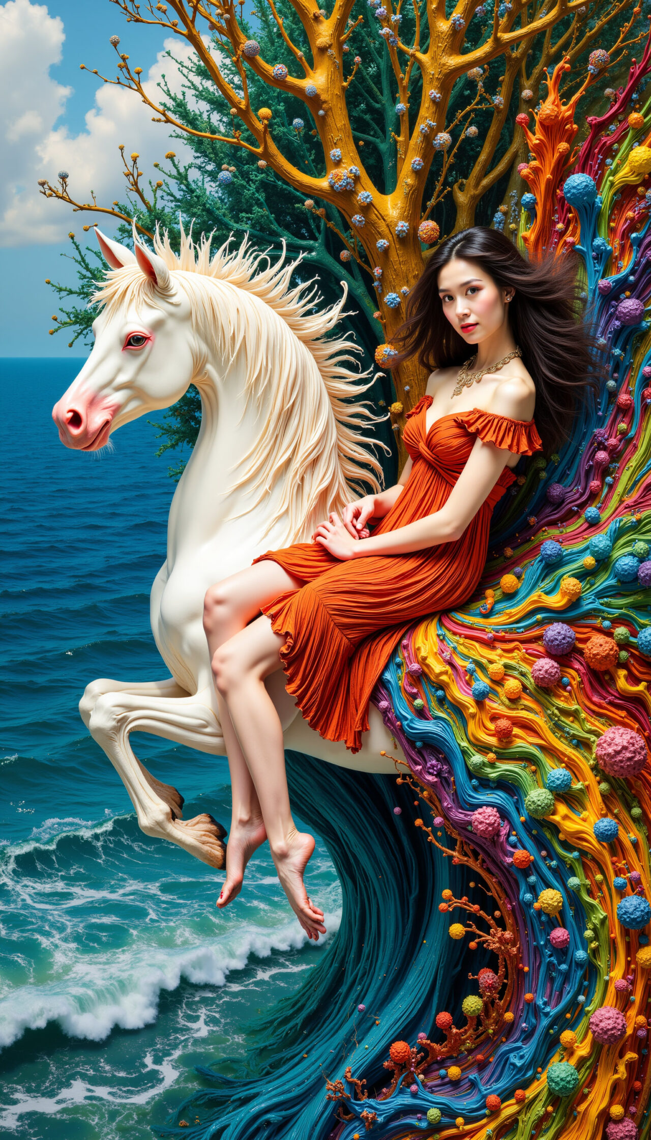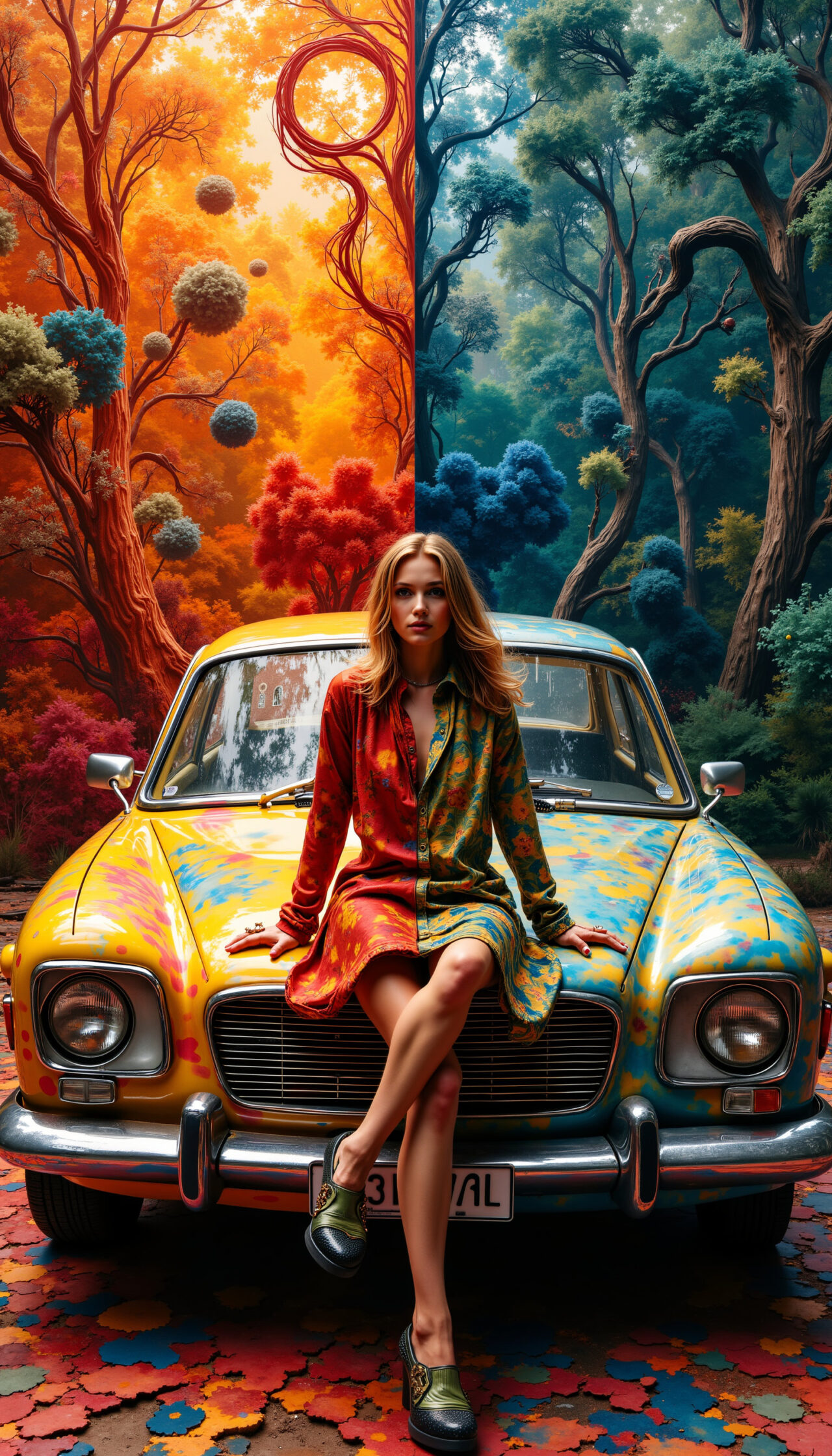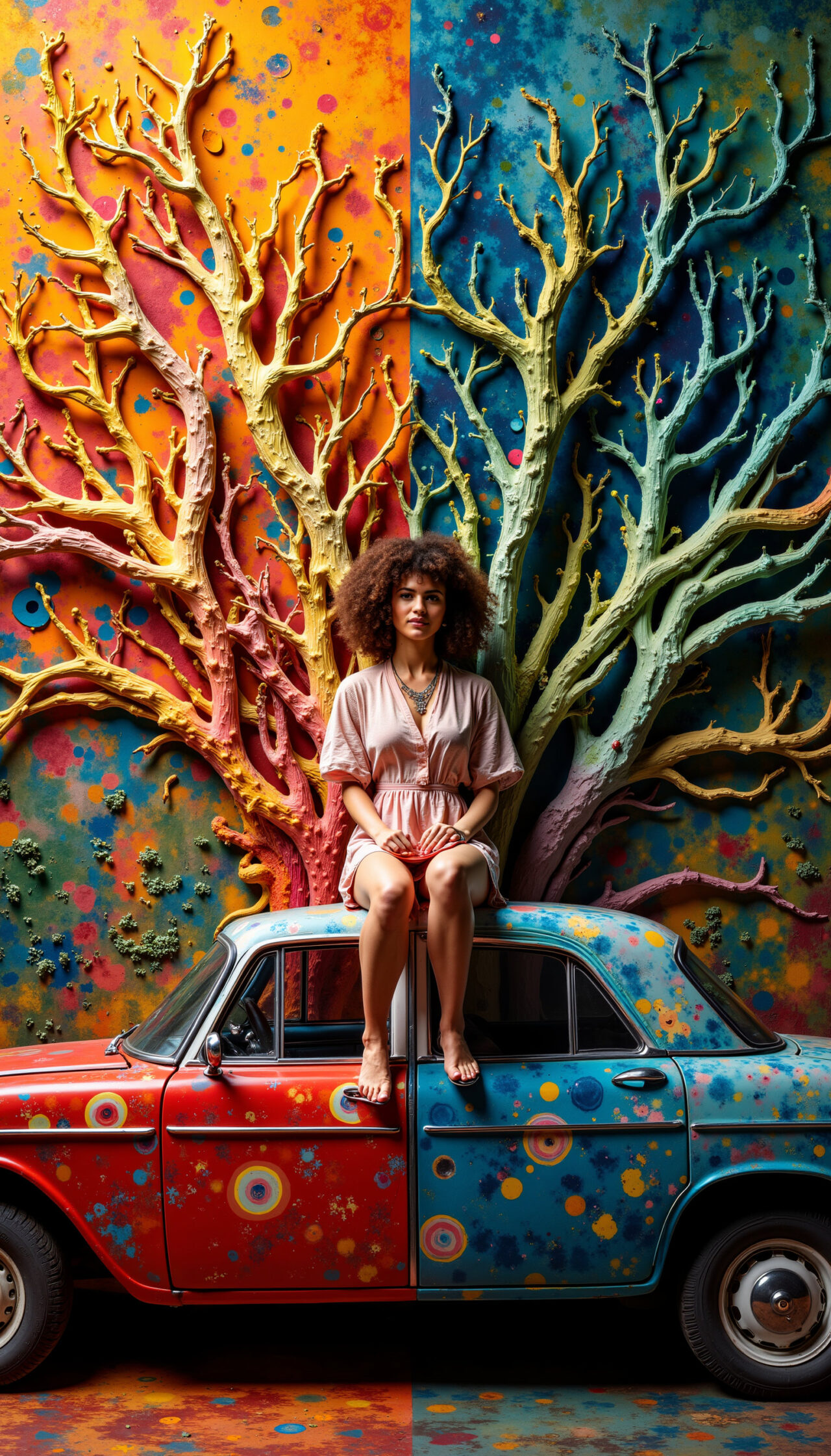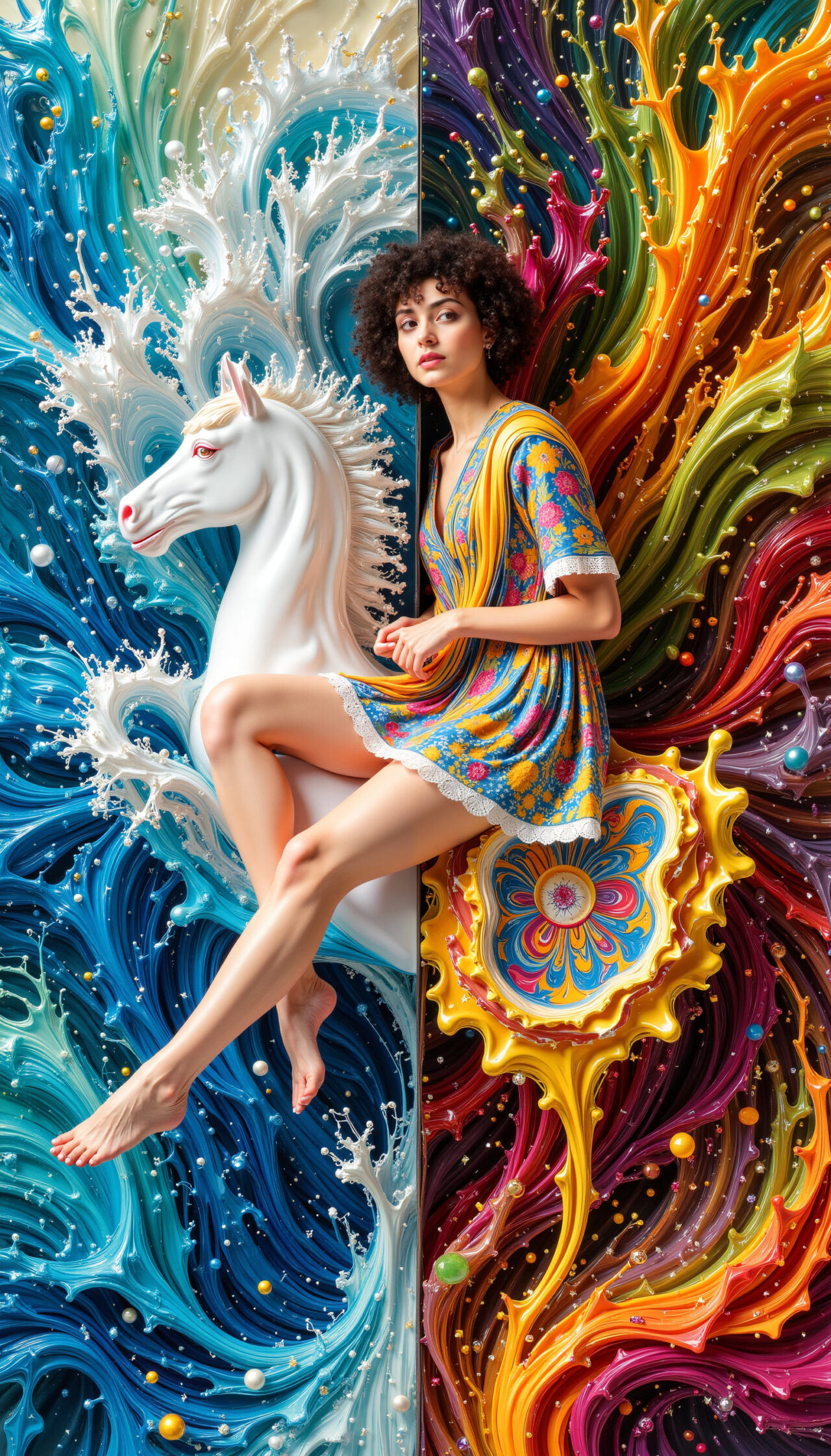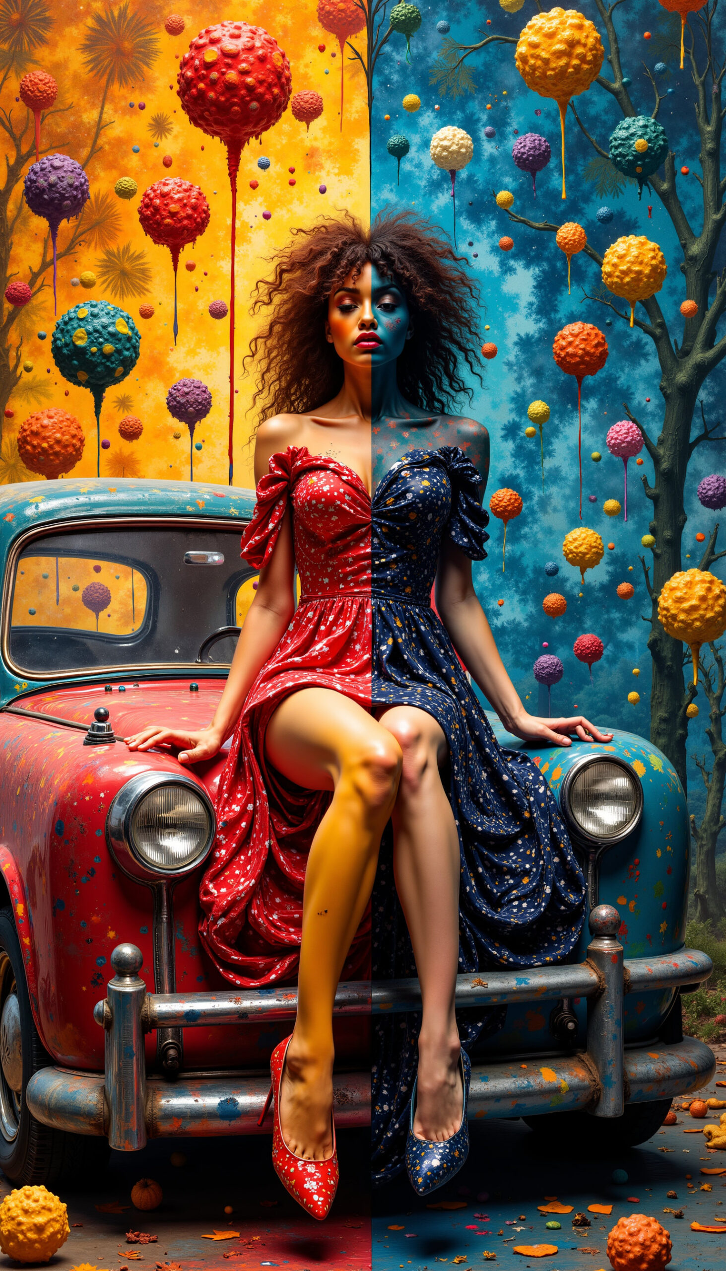 Color Dualism explores the contrast between two worlds – warm sunlit tones against deep cool shades, where surreal scenes unfold in bold parallel palettes. Horses, vintage cars and dreamlike figures become bridges between opposing atmospheres, blending fantasy, fashion and retro aesthetics into one striking composition. These visuals can serve as inspiration for creative campaigns – from posters and fashion editorials to album art, branding and cinematic moodboards.