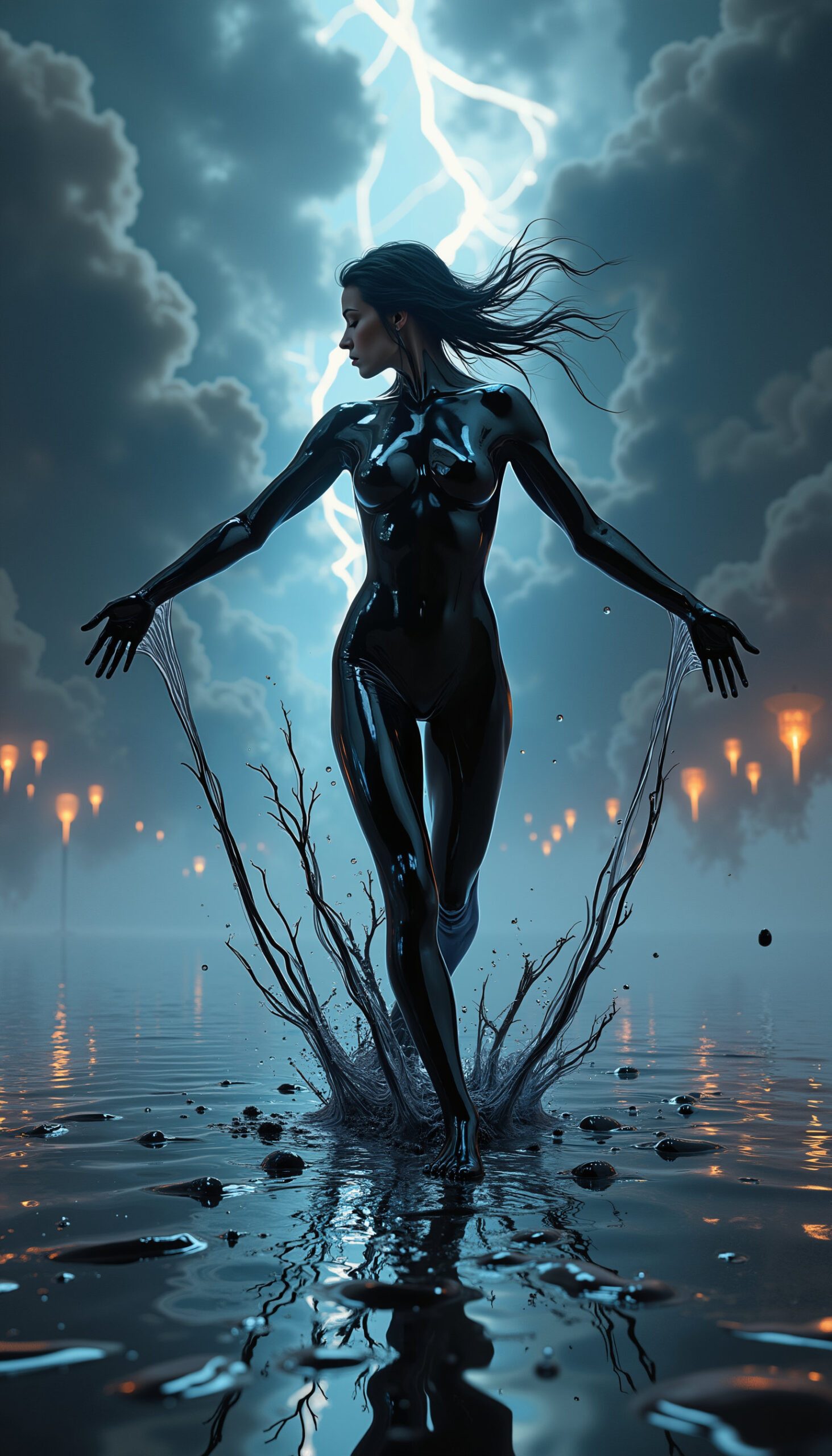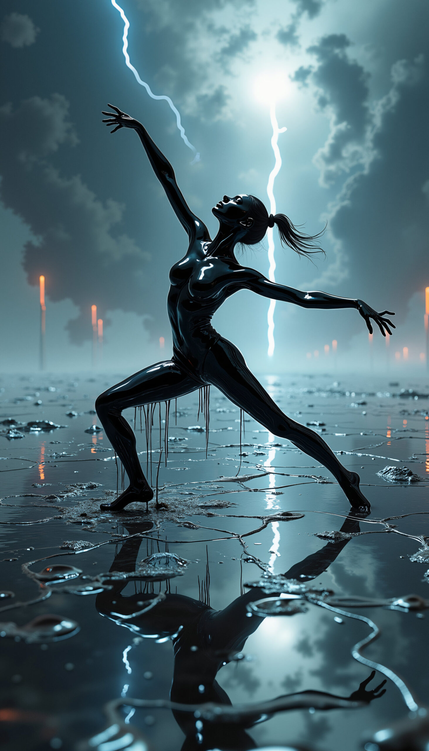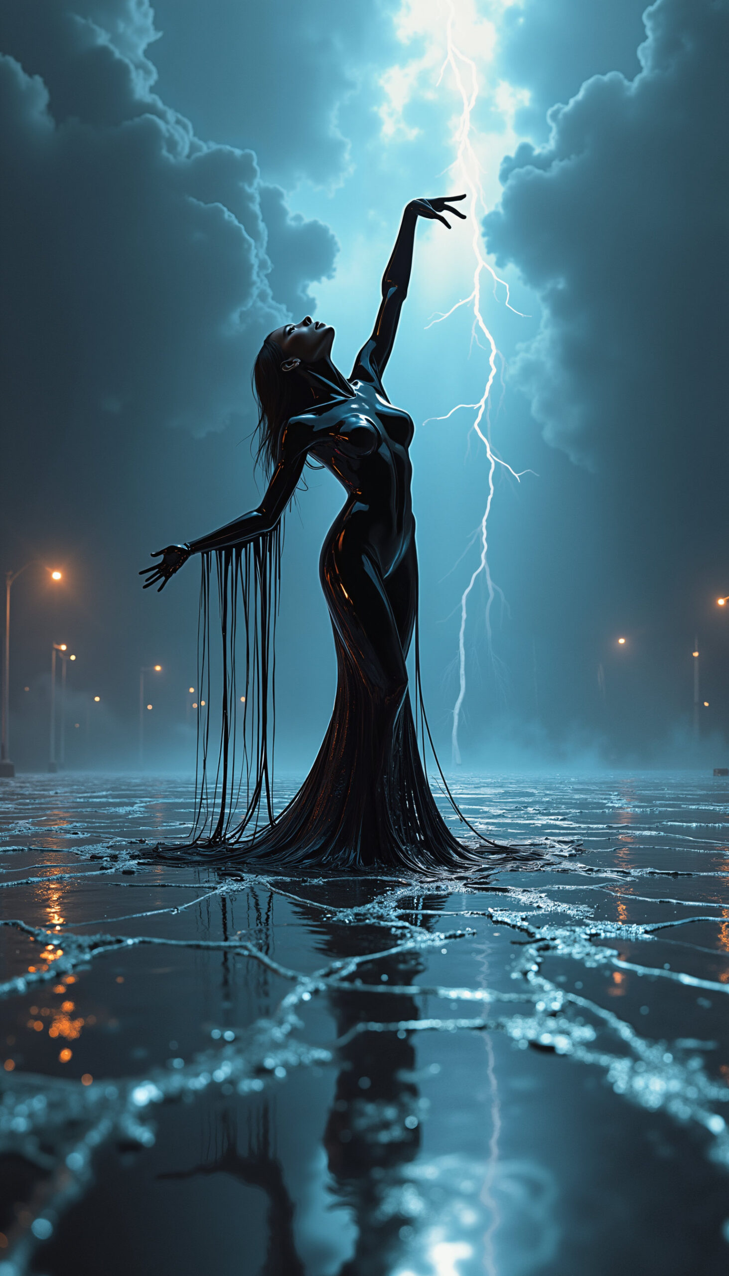 Echo of Nature captures a powerful union of human form and elemental force – bodies rising from storm-lit waters, lightning splitting the sky, reflections trembling across dark tidal pools. Metallic skin, fluid silhouettes and electric atmospheres turn nature into a living stage. This series is perfect for album art, cinematic posters, high-concept fashion, environmental storytelling and surreal editorial visuals.