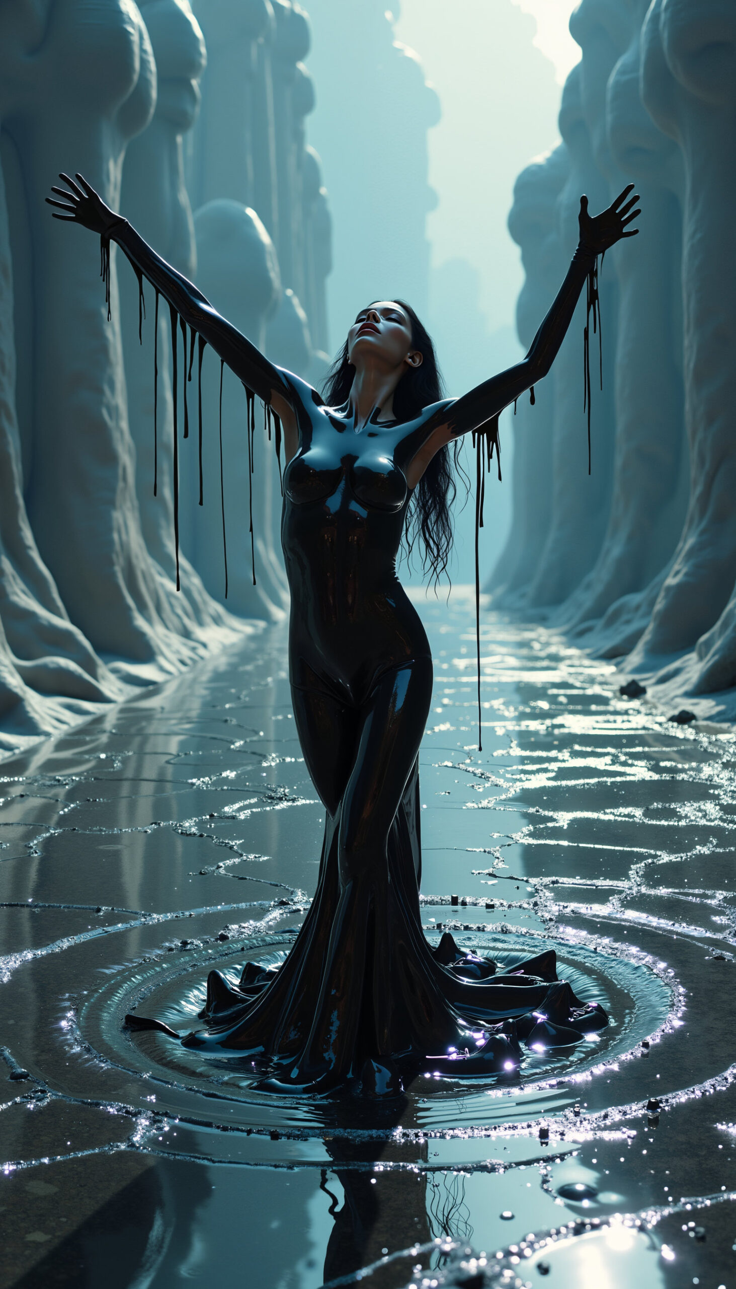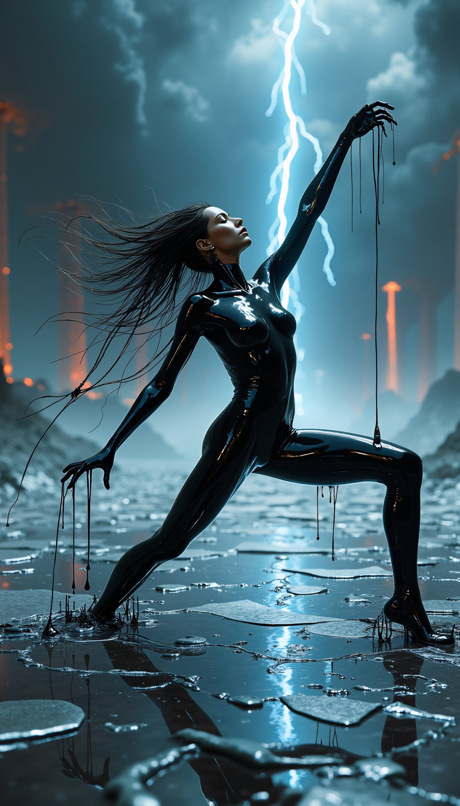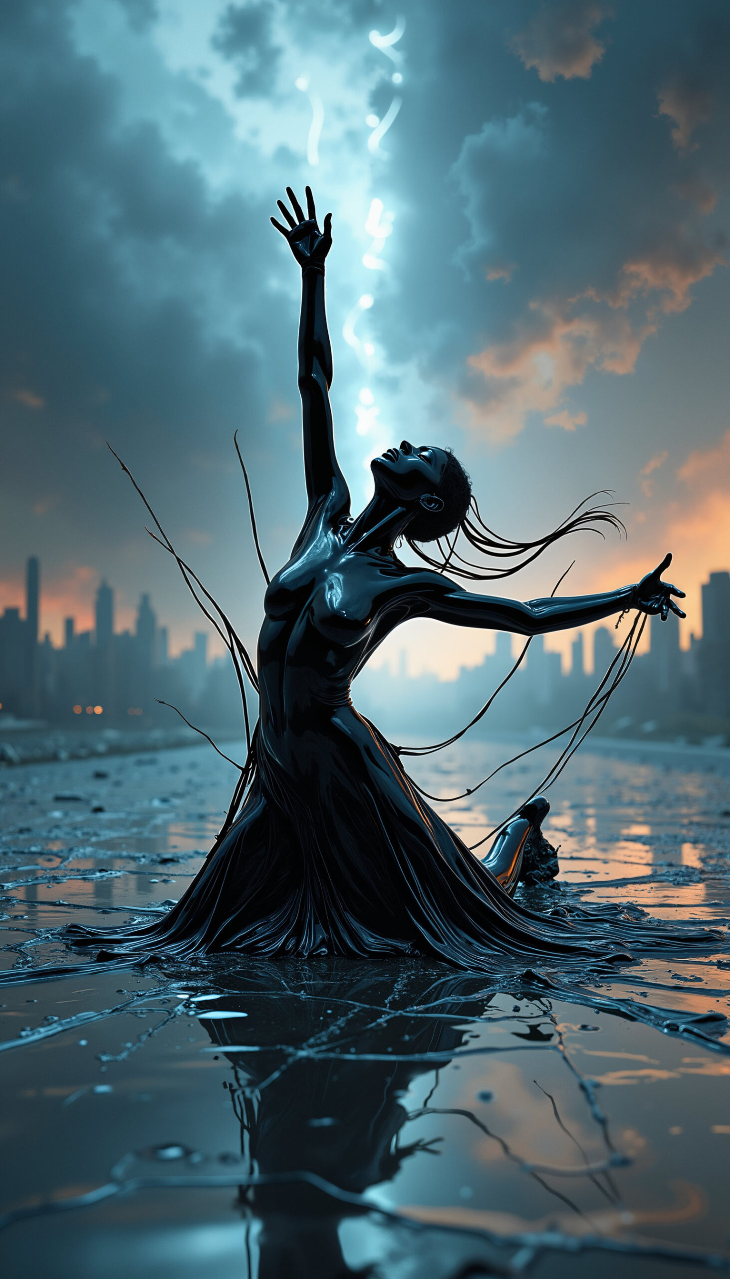 Echo of Nature captures a powerful union of human form and elemental force – bodies rising from storm-lit waters, lightning splitting the sky, reflections trembling across dark tidal pools. Metallic skin, fluid silhouettes and electric atmospheres turn nature into a living stage. This series is perfect for album art, cinematic posters, high-concept fashion, environmental storytelling and surreal editorial visuals.