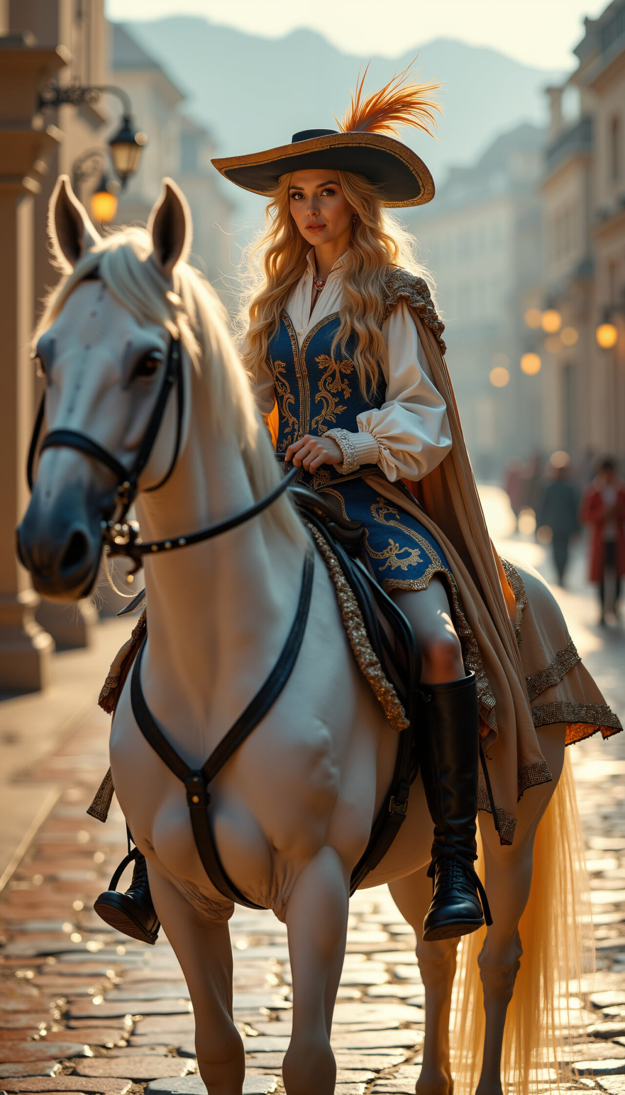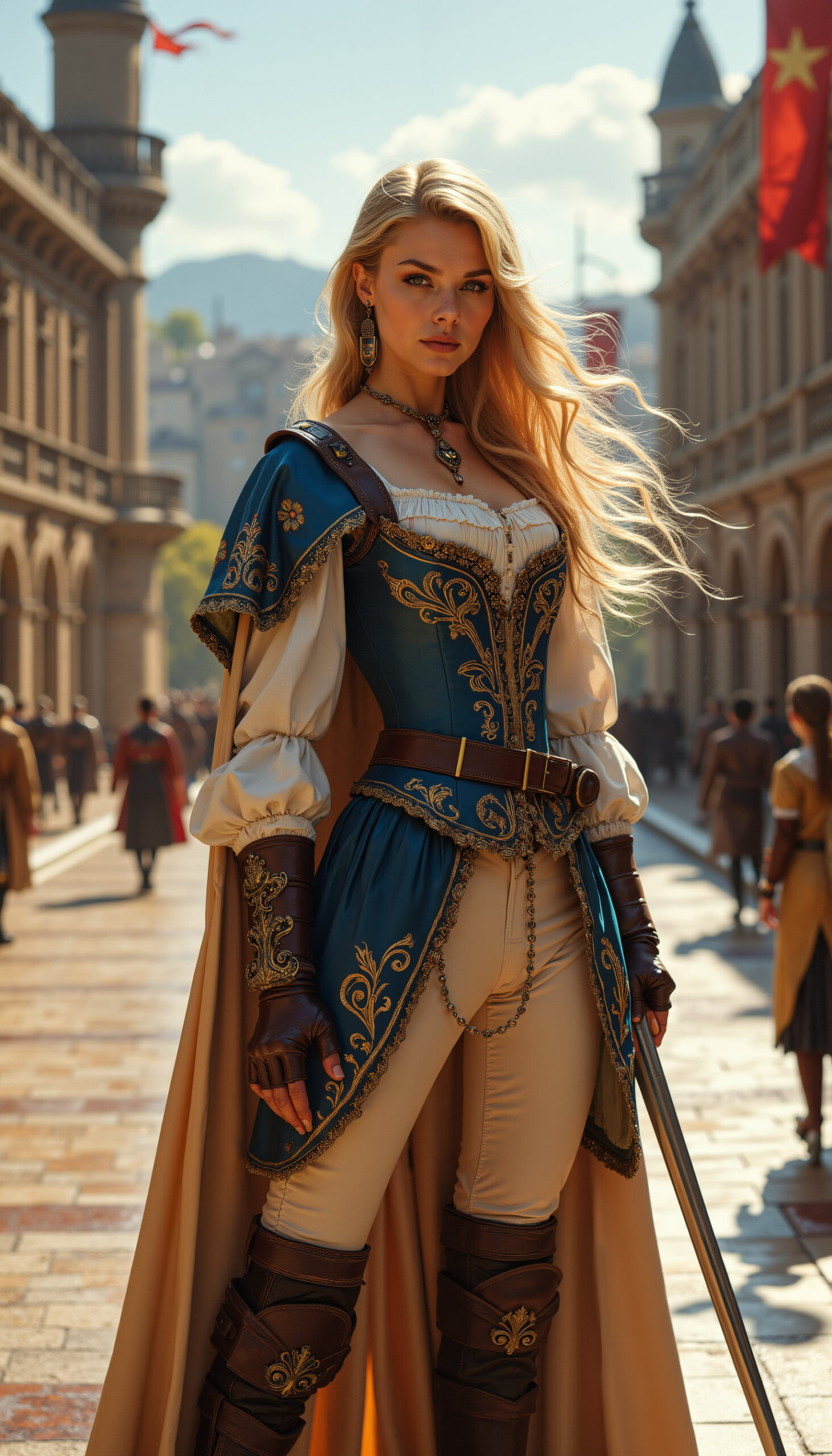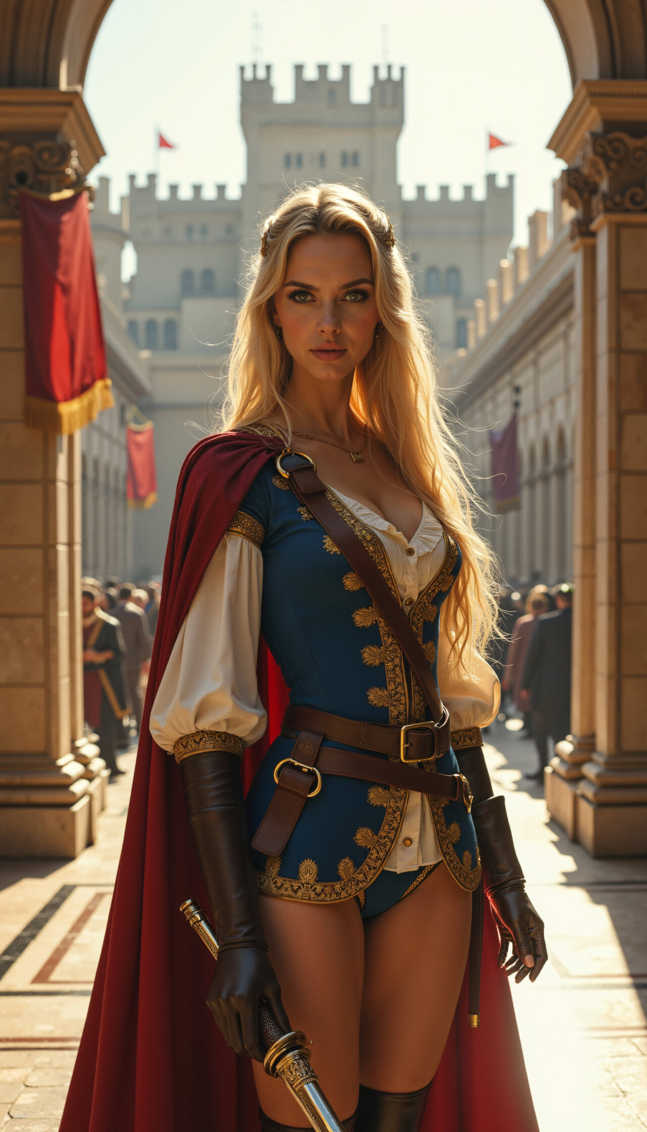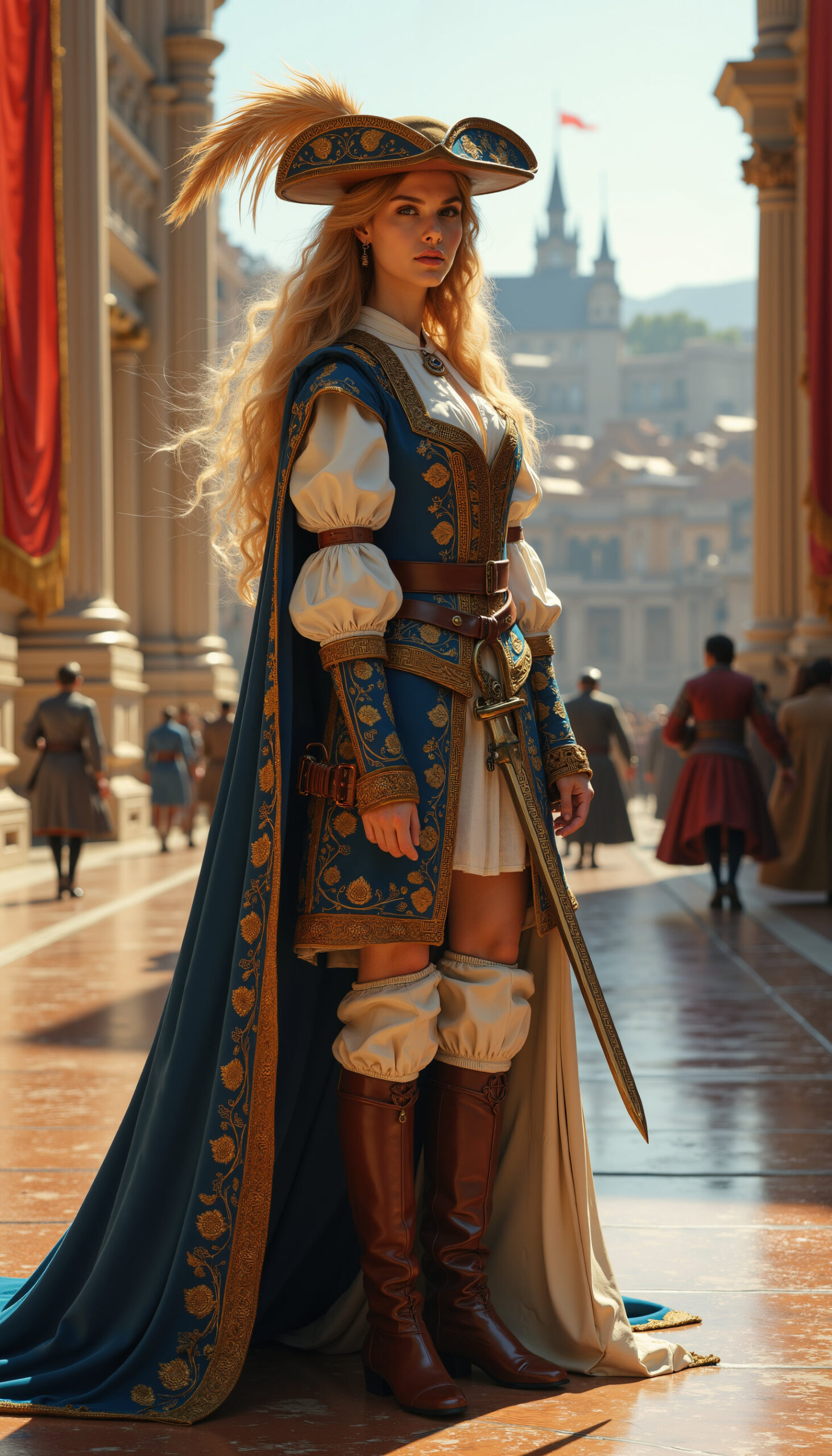 Musketer brings a modern cinematic take on the classic swashbuckling hero – ornate uniforms, rich brocade textiles, tall boots and steel at the hip. Set inside sunlit European streets and grand castle avenues, each portrait blends elegance with adventure, evoking tales of courage, loyalty and royal intrigue. This collection fits perfectly for character development, costume references, book covers, historical fiction and visual storytelling.