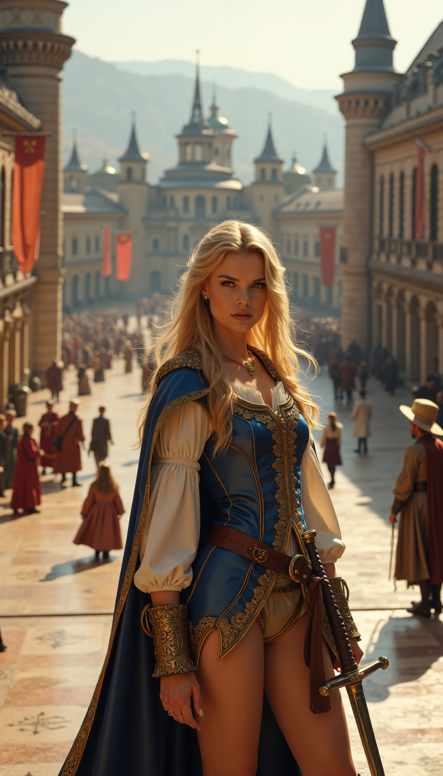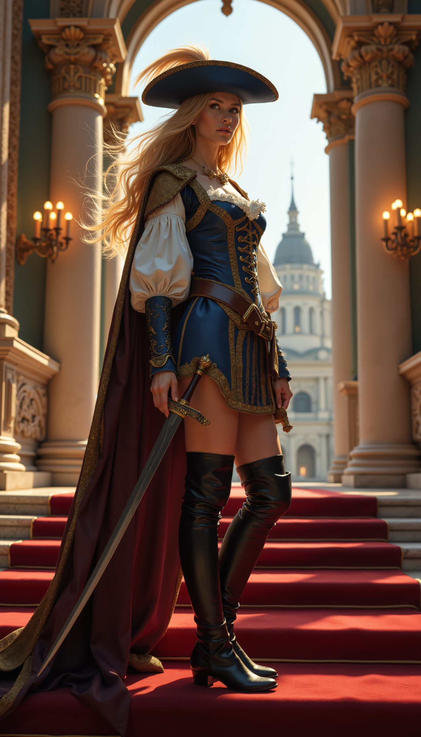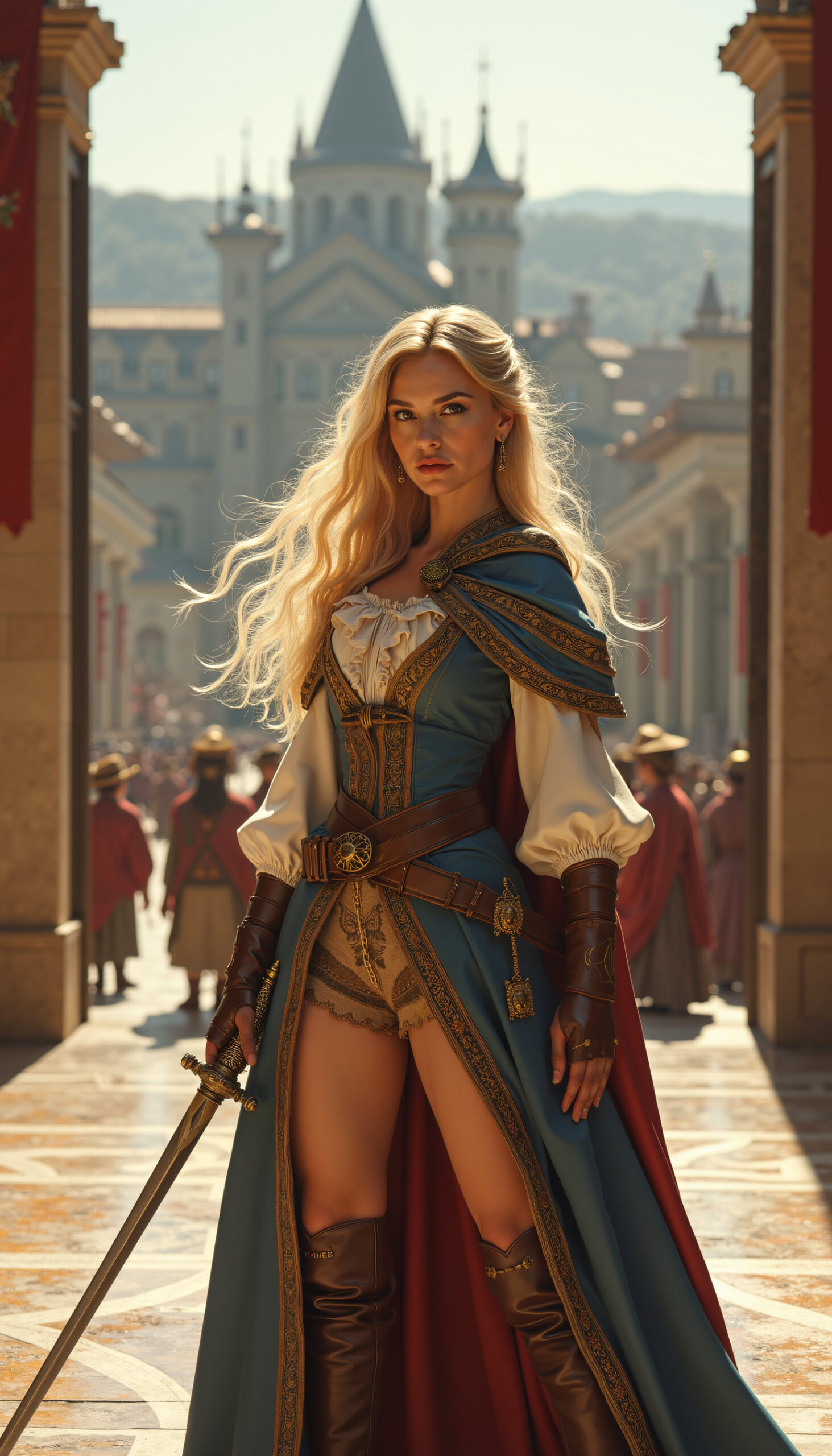 Musketer brings a modern cinematic take on the classic swashbuckling hero – ornate uniforms, rich brocade textiles, tall boots and steel at the hip. Set inside sunlit European streets and grand castle avenues, each portrait blends elegance with adventure, evoking tales of courage, loyalty and royal intrigue. This collection fits perfectly for character development, costume references, book covers, historical fiction and visual storytelling.