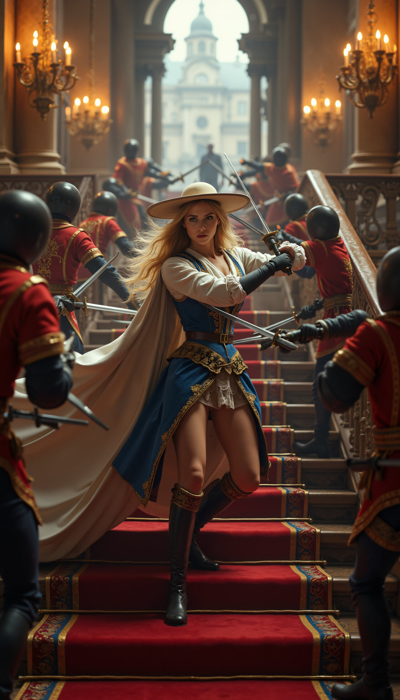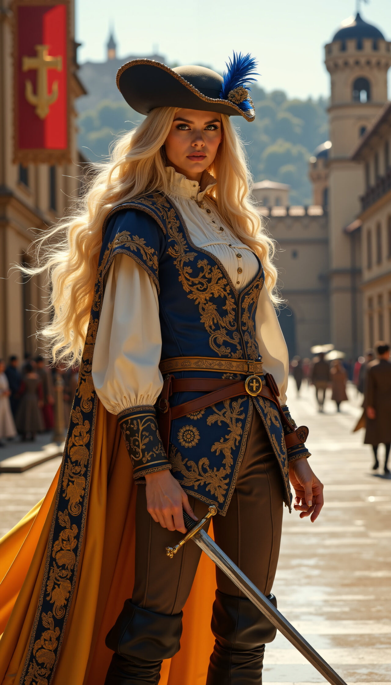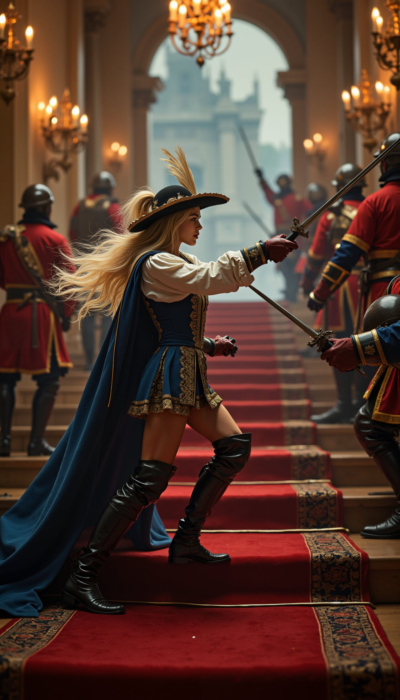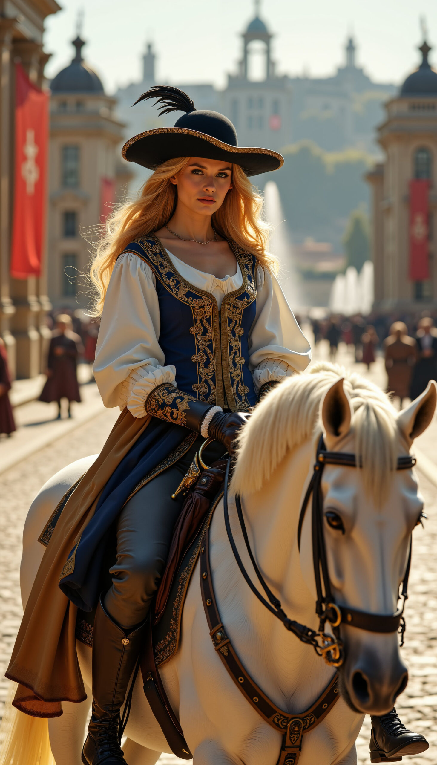 Musketer brings a modern cinematic take on the classic swashbuckling hero – ornate uniforms, rich brocade textiles, tall boots and steel at the hip. Set inside sunlit European streets and grand castle avenues, each portrait blends elegance with adventure, evoking tales of courage, loyalty and royal intrigue. This collection fits perfectly for character development, costume references, book covers, historical fiction and visual storytelling.