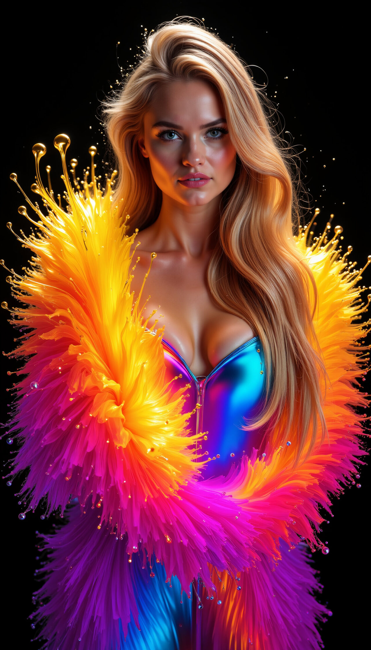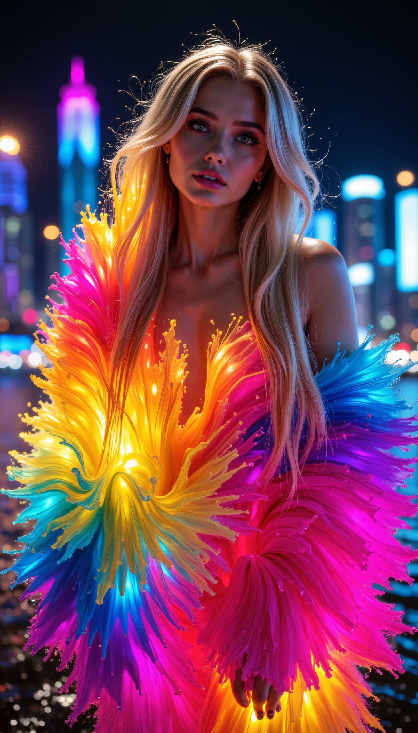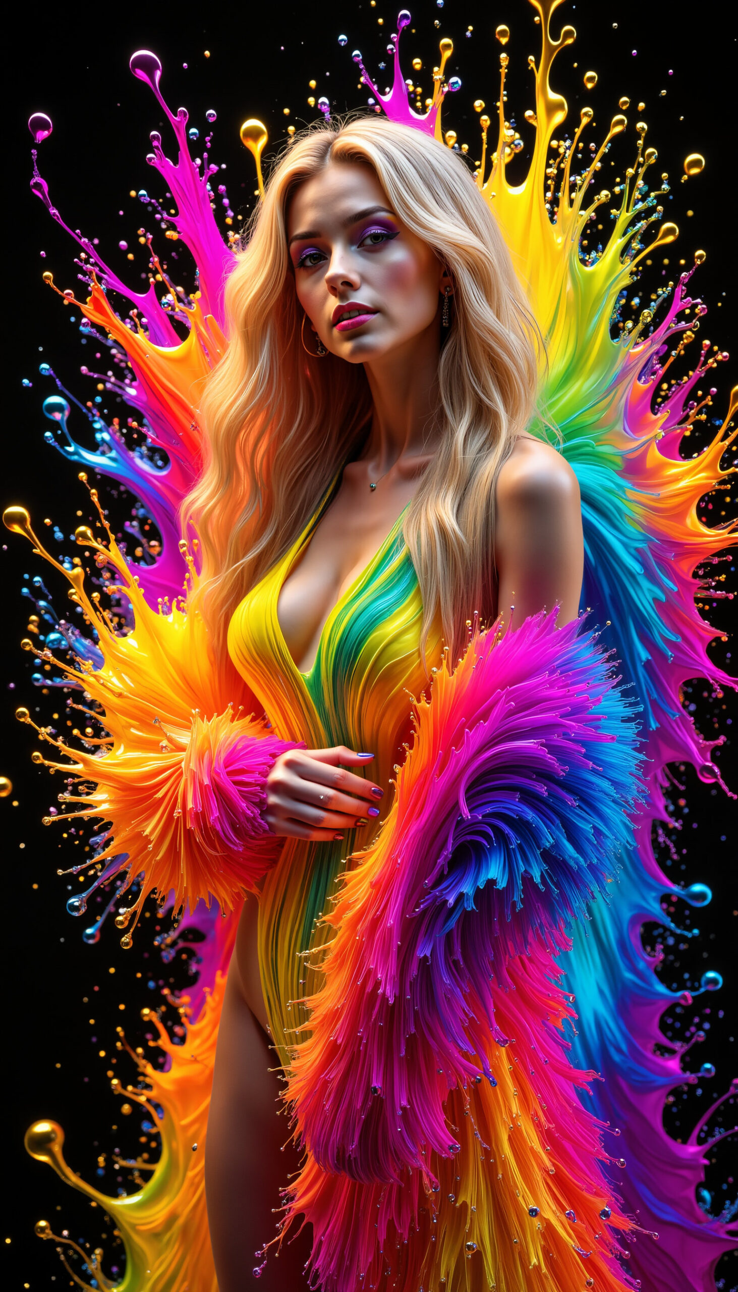 Neonbloom bursts with color and electric glamour – radiant fabrics blooming like neon petals around the figure. Bold, vibrant and instantly eye-catching, the series blends fashion elegance with luminous fantasy. These visuals can serve as inspiration for creative campaigns – from festival fashion and editorial covers to brand identity, music visuals and high-impact social content.