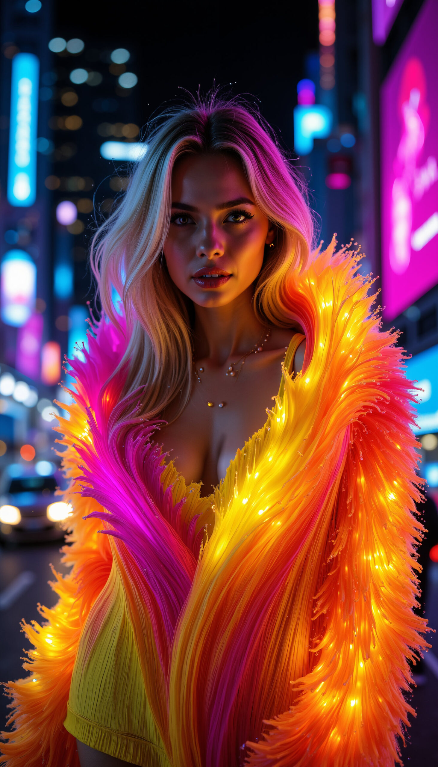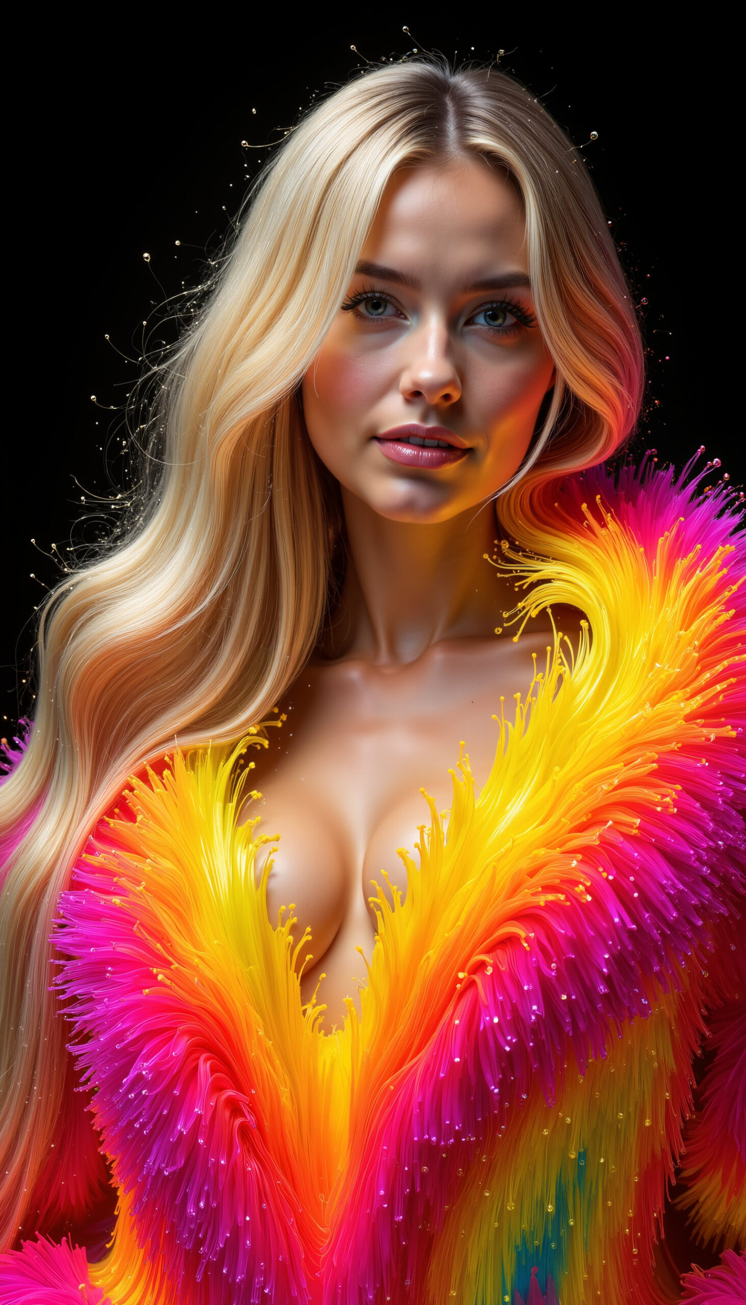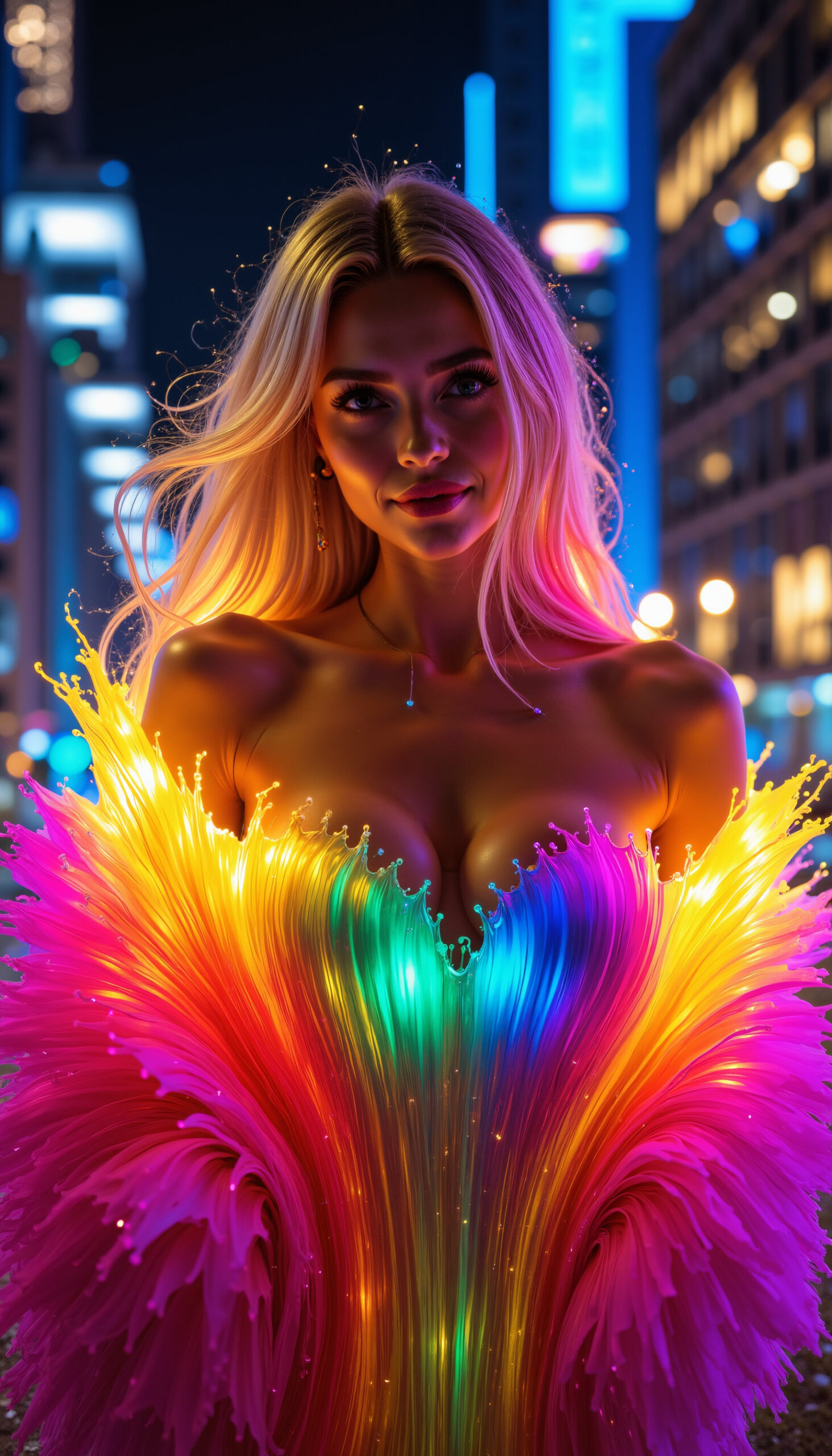 Neonbloom bursts with color and electric glamour – radiant fabrics blooming like neon petals around the figure. Bold, vibrant and instantly eye-catching, the series blends fashion elegance with luminous fantasy. These visuals can serve as inspiration for creative campaigns – from festival fashion and editorial covers to brand identity, music visuals and high-impact social content.