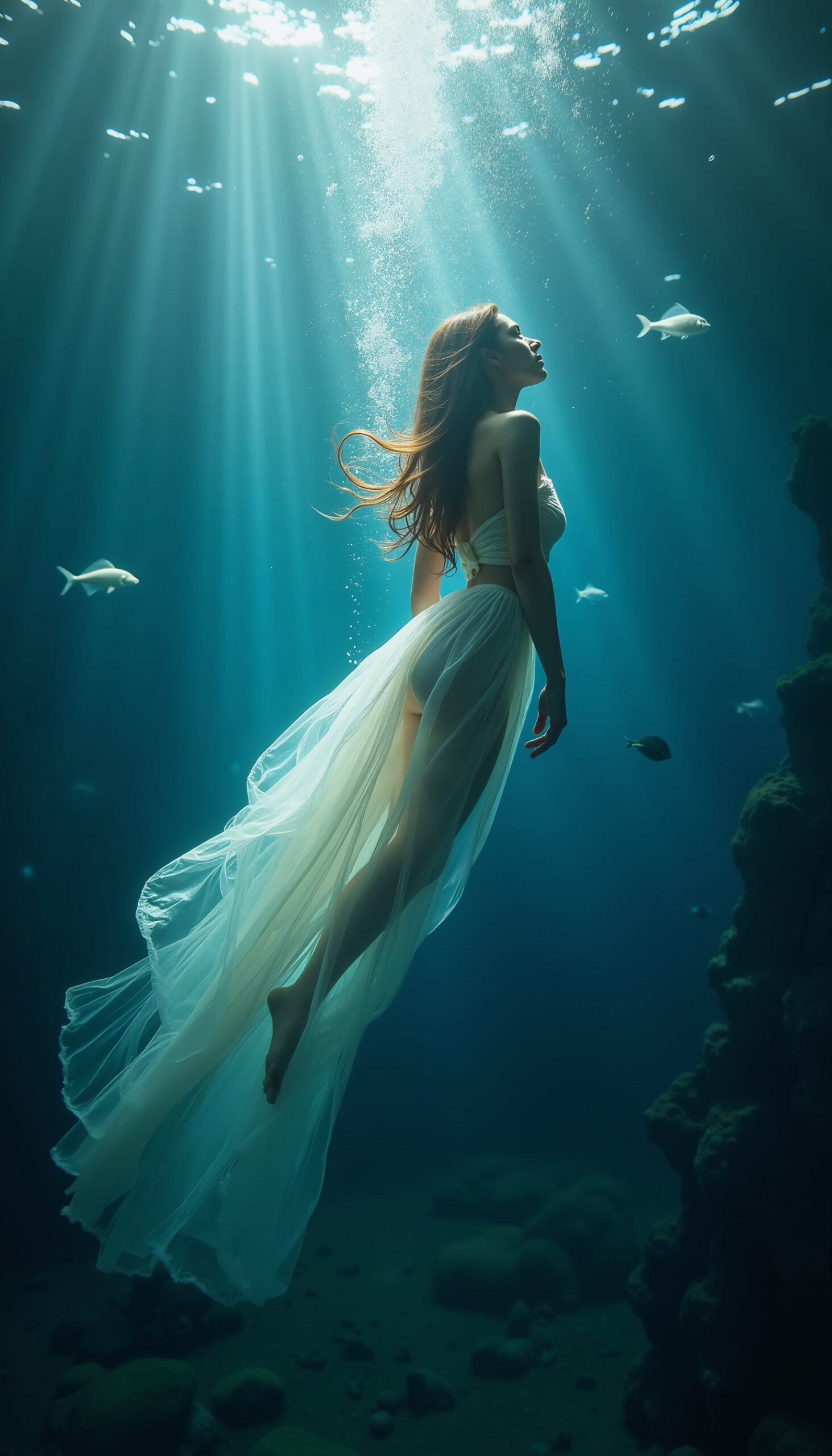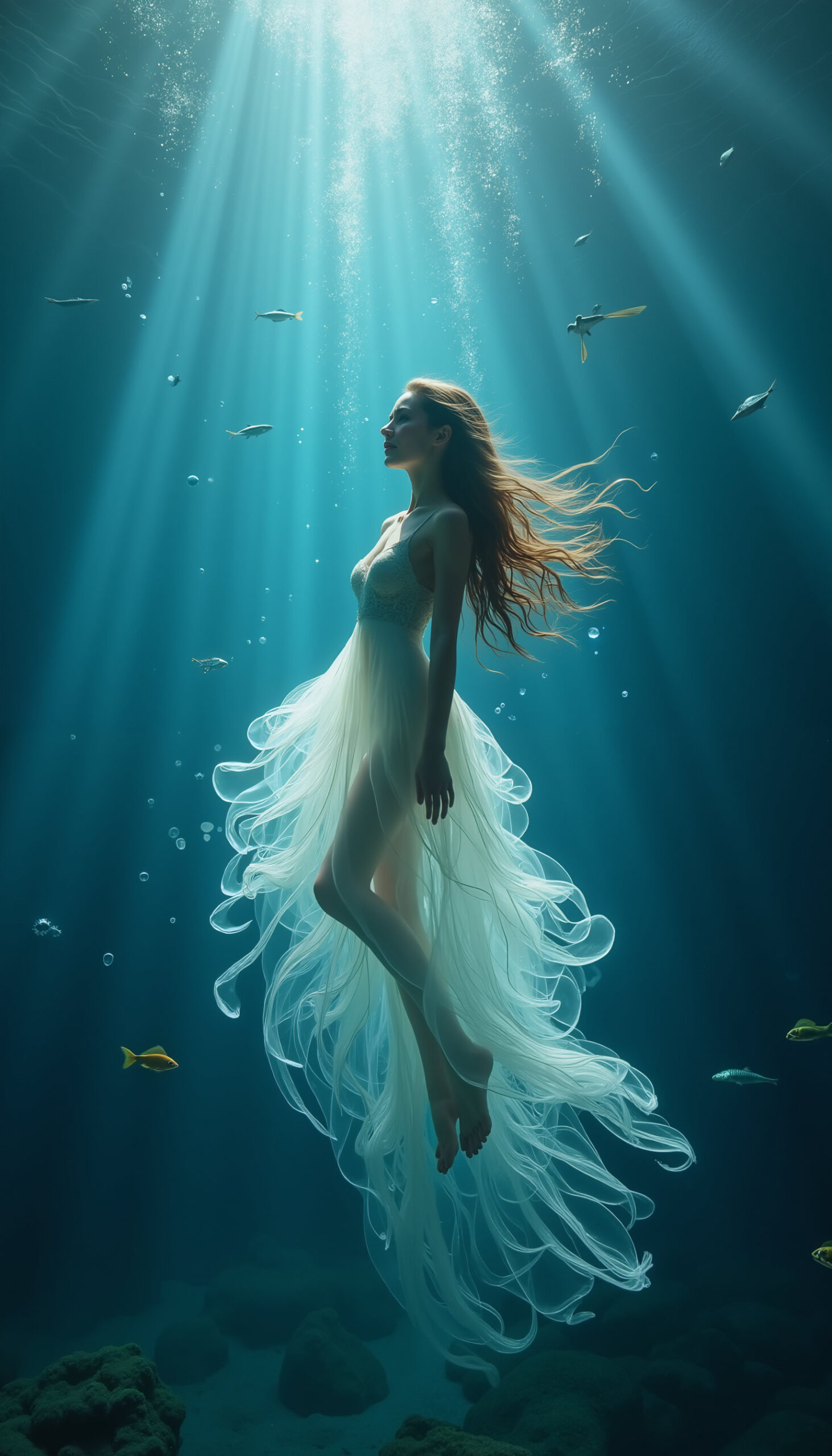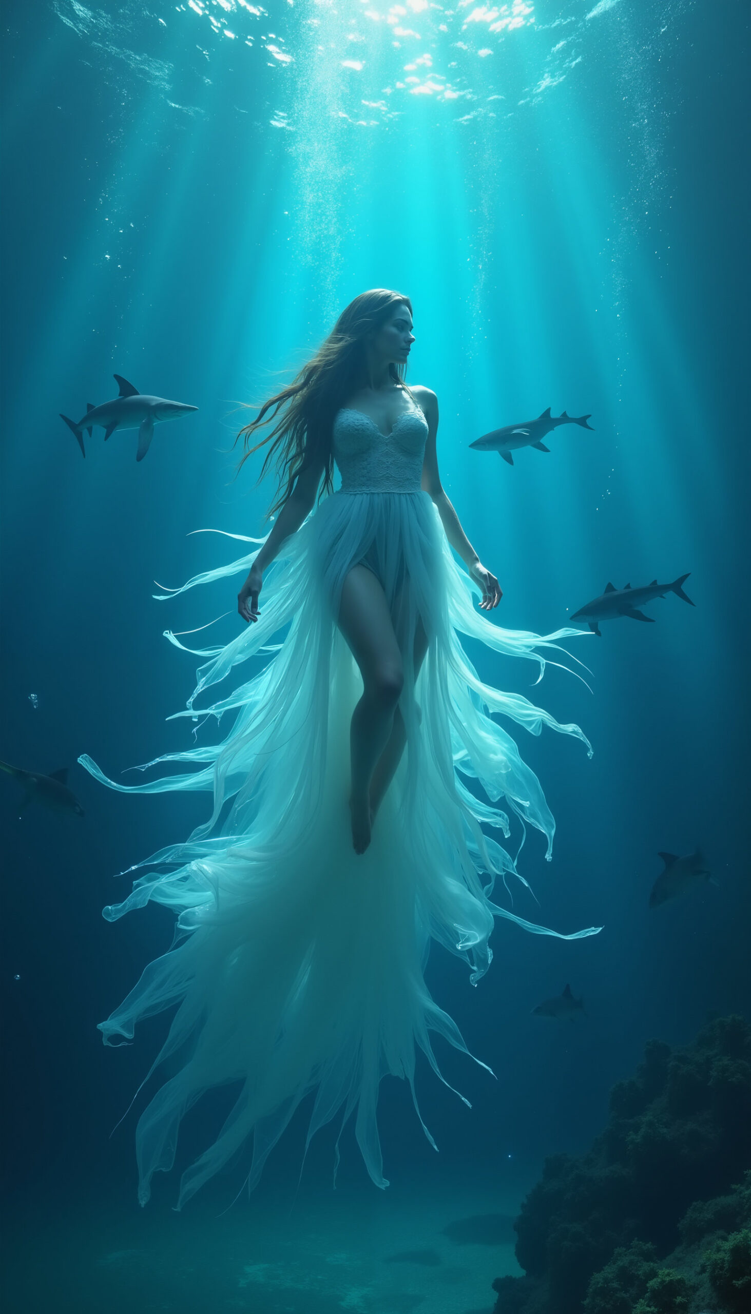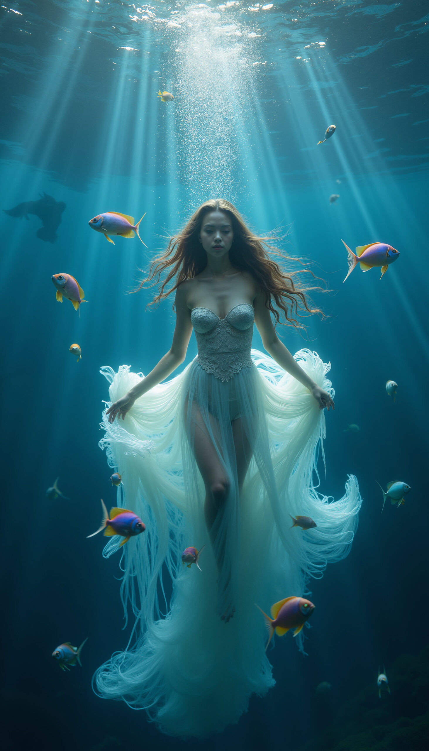Underwater Ethereal Dreams is a surreal ocean-themed fashion series where flowing gowns drift like silk in deep blue light. Models appear suspended among fish, rays of sun cutting through the water, creating a calm yet cinematic dreamscape. This visual set works beautifully for conceptual fashion projects, album visuals, film moodboards, editorial campaigns and artistic brand storytelling with a serene aquatic aesthetic.